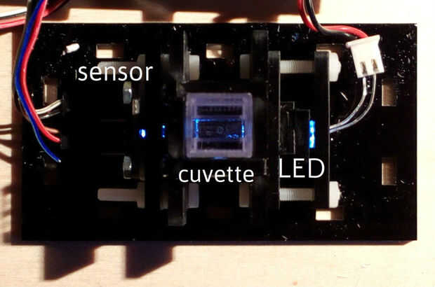 El dispositivo está construido para medir soluciones acuosas o suspensiones colocando una cubeta estándar fotómetro entre LED y el sensor. Estoy usando cubetas desechables de poliestireno (PS) o acrílico, y volumen completo y cubetas semi-micro de trabajo. Puede obtener 100 tales cubetas para unos 12 - 20 €, dependiendo del tipo y material, y se puede utilizar varias veces.