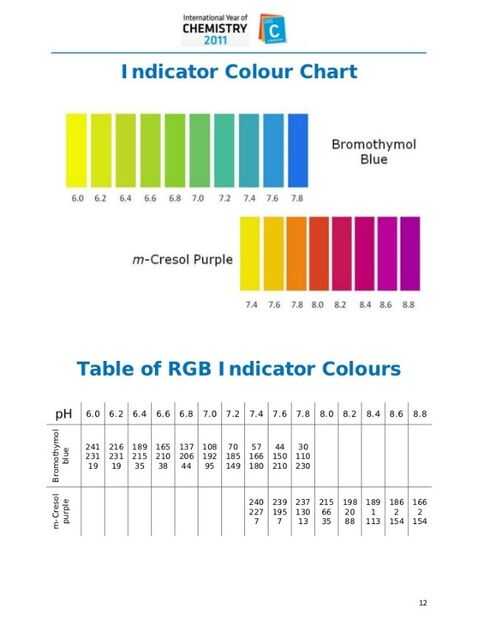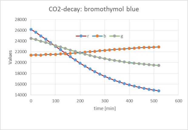 Usando el sensor RGB, es posible detectar el decaimiento de la forma amarilla en el canal azul y el aumento de la forma azul en el canal rojo, mientras que el efecto sobre el canal verde es solamente moderado. Como se aprecia en la tabla, con el tiempo la absorción en el canal azul disminuye (es decir, menos colorante amarillo) y la absorción en el canal rojo aumentan (es decir, más tinte azul). Como era de esperar, los cambios de color en el tiempo indican un aproximado primer orden decaimiento cinéticos, valores asintóticos acercando los valores máximos o mínimos