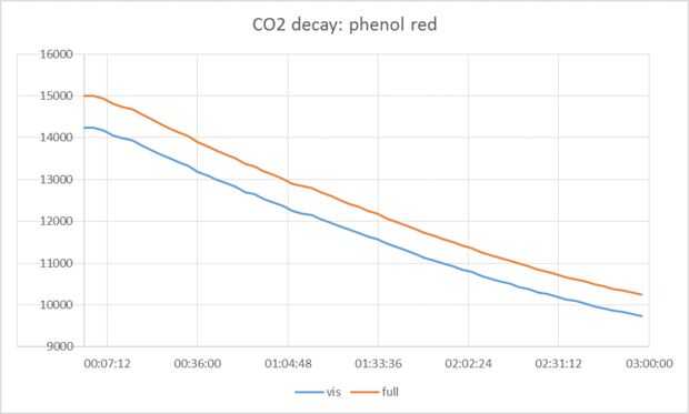 El mismo proceso también ha sido medido con el fotómetro. El sensor le da dos valores: un valor de espectro completo (Full) y un valor de un segundo sensor incorporado que mide solamente la parte de (IR) infrarroja del espectro. Los valores de la parte visible del espectro (VIS) se pueden estimar por la substracción de IR de valores completos. El colorante utilizado aquí fue rojo de fenol, que es de color amarillo en los ácidos, rojos neutro y violeta bajo condiciones básicas. Su pKa es también alrededor de 7.0. La fuente de luz utilizada aquí fue un LED verde, por lo que el aumento de "enrojecimiento" dio lugar a una cantidad disminuida de verde luz alcance el sensor.