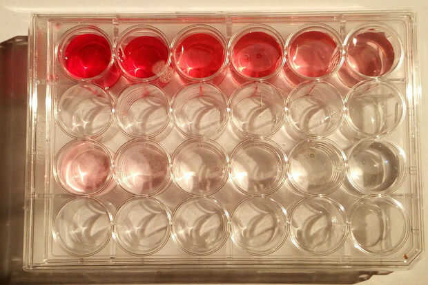 Como se muestra en la imagen, una serie 1:2 dilución se estableció, con un valor adicional en blanco. Las diluciones fueron medidas de la menor a la concentración más alta, usando el sensor fotométrico (TSL2591) y un LED verde (Nichia NSPG500DS) como fuente de luz. Los valores medidos fueron escritos a un archivo CSV y analizaron usando LibreOffice Calc.