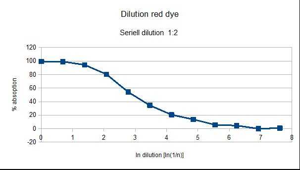 El gráfico resultante de la lin-log (lineal: absorción vs logarítmicas: concentración) dio la típica curva S-shaped en estas mediciones. A bajas concentraciones hay una relación directa entre la concentración de colorante y absorción de la luz, mientras que en concentraciones más altas se aproxima asintóticamente a un nivel máximo (absorción total). Usando la curva, la gama de detección útil puede estimarse para cubrir dos registros (100 x) de la concentración, que es razonable para un dispositivo fotométrico.