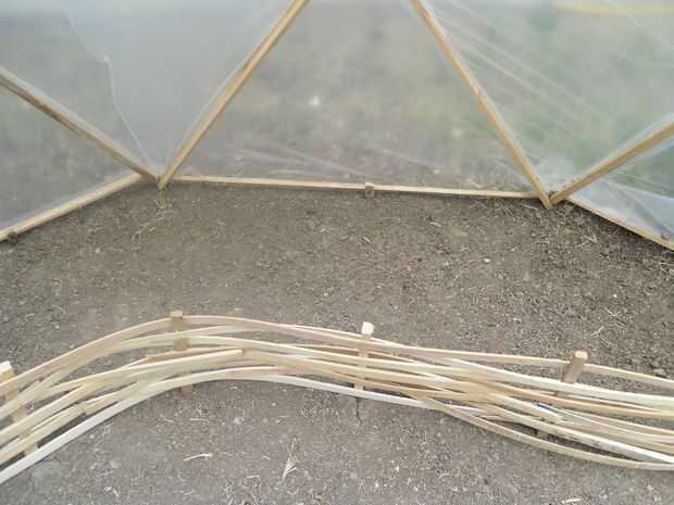 Después de que me tejió una valla de clases usando pedazos delgados listones de madera y tejió en un out entre las apuestas en un patrón alterno de abajo hacia arriba. Luego termina metido en las piezas del marco de la puerta en el suelo.