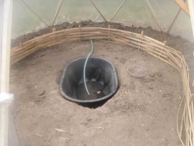 Me funcionó la línea a lo largo de la tierra, debajo del borde del efecto invernadero, cavado hacia fuera un lugar en el centro del invernadero y colocar el forro del estanque plástico en él.