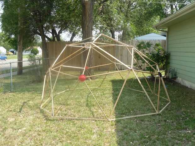 Una vez terminado este paso el resto del alambre 48" piezas a los lugares de la tierra para todos cinco pentágonos se unen a nivel del suelo y ayudan a mantener la cúpula vertical.