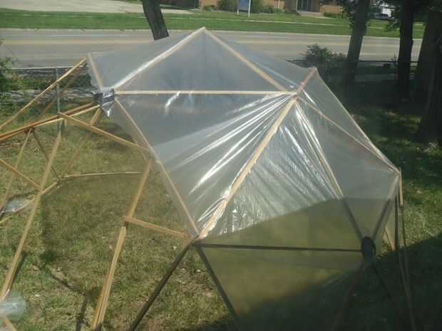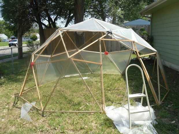 Seguir haciendo esto hasta que la cúpula está cubierta totalmente. --excepto la puerta de manera! Por el contrario cortar algún plástico para caber alrededor de su puerta en el interior y exterior y con 6" exceso en todos los lados. Grapa para la puerta en el frente y espalda - dejando el exceso colgándose. Este exceso será una especie de sello de la puerta y mantenga el aire interior caliente bastante.