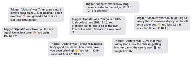 Una vez completada la instalación, recibirá un SMS cada vez que se pese que contiene tu peso, cuánto usted peso cambiado desde la última medición y un chiste al azar / insultar / complementar.