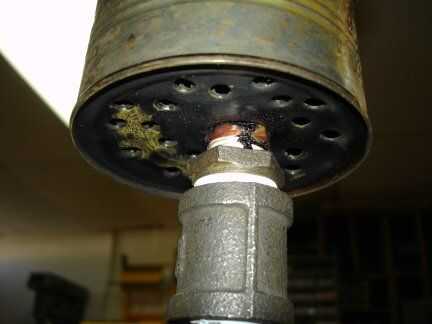Aquí puede ver la parte inferior del quemador. Es que sólo una viejo haba 18 onzas puede con muchos agujeros de aire perforados en la parte inferior. Se sienta encima de la tubería de salida del gasificador y el gas entra a través de un gran agujero en el centro de la lata inferior. La parte superior de la lata está abierta. El gas y el aire de la mezcla dentro de la lata.