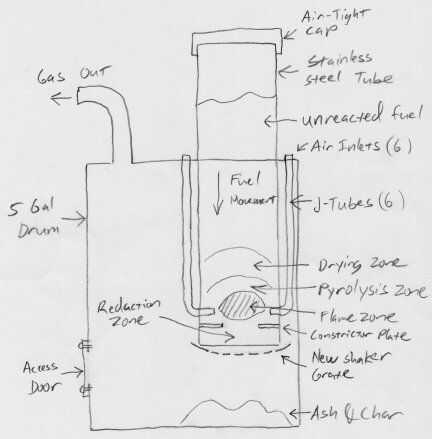 Un tubo de acero inoxidable 4 1/4 pulgadas de diámetro sirve como ambos tubo de reacción y tolva de combustible. Hay una constricción en el tubo cerca de la parte inferior. Una rejilla de acero inoxidable perforada en la parte inferior del tubo evita que los contenidos sólo se derrame fuera de la base. La rejilla puede mover y es sacudida periódicamente durante la operación para permitir que la ceniza y carbonilla salida el tubo de reacción y permitir el combustible fresco para caer en la zona de reacción. Los gases producción viaje hacia abajo y salir por la rejilla de la coctelera. Por lo que este tipo de gasificador es llamado un gasificador de tiro descendente.