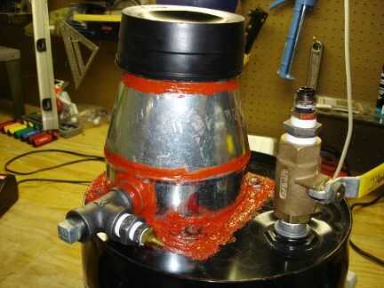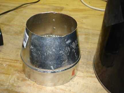 Aquí es el colector que hice para cubrir las entradas de todos los seis j-tubos. Se redujo de un 6 a 4 en acero accesorio de reducción de conducto de AC. Que se desliza hacia abajo sobre el tubo de reacción y se siliconada a la parte superior de la brida. Se instalará una conexión de entrada de aire única en el lado del colector.