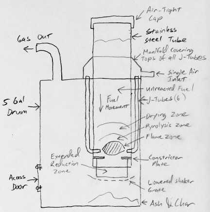 Aquí es otro dibujo que muestra el generador de gas en su forma final (hasta ahora). Si yo había pensado en un principio, habría hecho las tapas de los tubos de j palo lo suficiente como para que todos pudieran estar conectados junto con tuberías de cobre para hacer un colector estándar. Por desgracia, yo no estaba pensando en ese día. Así más tarde, cuando llegué a la conclusión de que necesitaba para conectar todas las entradas del tubo j juntos, tuve que venir para arriba con otra idea. Sólo aquellos que tratando de construir su propio generador de gas deben extender un poco los tubos de j y les plomo juntos. No se lo hice a menos que seas un glutton para el castigo. Mi improvisada múltiple es siempre surgiendo filtraciones y tiende a soltarse cuando retire el montaje de la base del tambor.