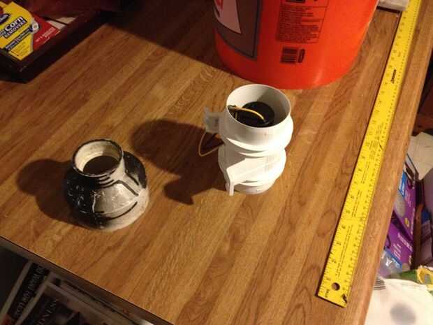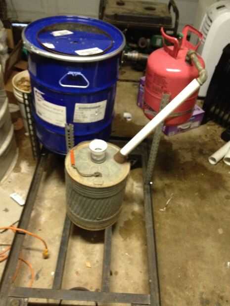 Un reductor de 1 1/2 "x 2" se une a la tapa de rosca de la lata de gas. Un tubo de 1 1/2" PVC se levanta en el reductor, se une a la t, sube a una válvula de bola PVC luego subirá a un soplador de aire en línea Marina, que se utiliza para crear un vacío y tirar los gases a través del sistema. Tengo un quemador montado encima de esta pila, por lo que puedo comprobar si los gases están listos a la luz y Compruebe la calidad y el color de la llama. Si el sistema está funcionando correctamente, no sólo debería capaces de encender el quemador, debe acercarse a la llamarada resultante es azul en color. Esto se considera una señal de que los gases emitidos es libre de impurezas y en la cantidad adecuada de presión.