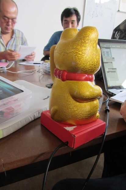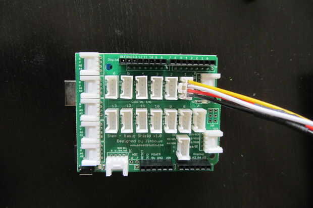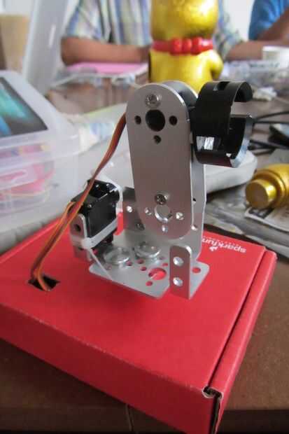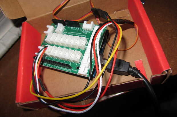 El primer pensamiento fue para Arduino, el escudo de la Base y todo lo demás dentro de la cat. Desafortunadamente, no había espacio suficiente. Entonces decidimos utilizar una caja pequeña como una base, que sirve como apoyo a lo interno de metal y contiene la materia de electrónica. El conjunto interior se levanta un poco para hacer que todo encaja, utilizando otra de las piezas de metal, que se curva 90° y luego atornillado a la caja.