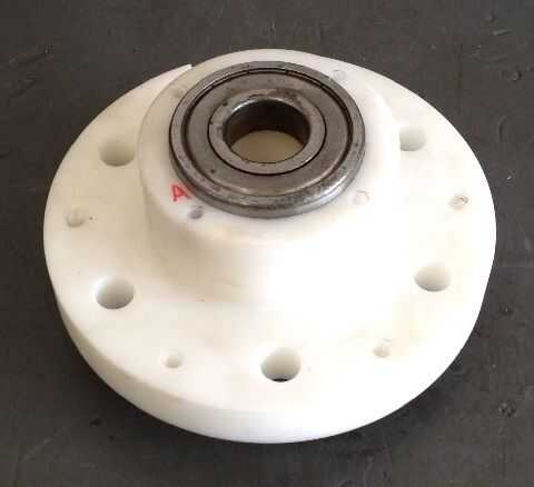 Esto puede ser la parte más difícil.  Necesita diseñar un eje que las bobinas con los imanes del espacio y también tienen algunos cojinetes resistentes en cada extremo.  Empecé con un bloque de plástico usado para un rotor de frenos de automóviles con aparato.  Puedes hacer lo mismo en un torno, o una acumulación de capas de madera o de otro plástico, etc..