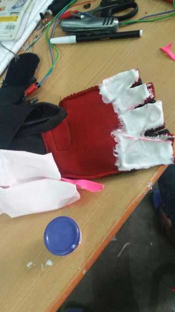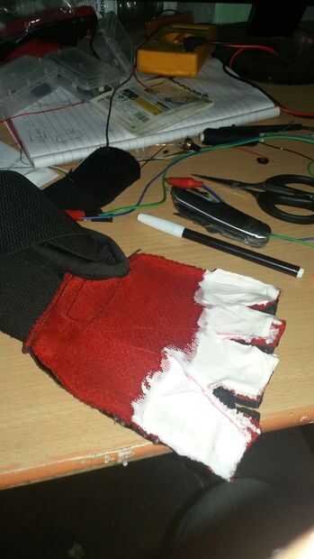 Tenemos que aislar ahora nuestro guante de interior cerca del dedo para dejar de recibir golpes. Este paso se incluye después de conseguir una buena descarga, también es necesaria aislar!! confía en mí!, he utilizado goma de globo para esto como su buen aislante que el algodón o el aire, vuelta alrededor del guante uso algún pegamento adhesivo para colocar la goma del globo, consulte imagen para el área de aislamiento (principalmente en los extremos de los dedos).
