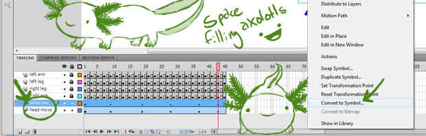 ¿Bueno, por lo tanto, ves ese ratón? ¿Bien, ahora aparece el el botón derecho en ese ratón? Perfecto, ¿por qué la izquierda? A continuación, bloquear todas las capas pero el torso uno. Bueno, ahora botón izquierdo haga clic al lado del torso de tu personaje y sostenerlo. Asegúrese de que tener la herramienta de flecha negra seleccionada. Ahora arrastre el cursor y en el torso y la cabeza y la liberación. Todgrados, ahora botón derecho haga clic en seleccionado torso y cabeza y seleccione "convertir en símbolo". La inflamación, ahora Asegúrese de que es un clip de película y nombre el símbolo de ok clicky izquierda. Multa y dandy, ahora derecho haga clic en el símbolo ahora se puede convertir y seleccione crea interpolación de movimiento (nota, asegúrese de estar en el primer frame/fotograma clave). Adecuada, ahora mover el torso y la cabeza a lo largo de cómo desea crear fotogramas clave donde desee que deslice a y doblar la ruta que desee. Por ejemplo, si en una cuarta parte de la manera, querido bajar, simplemente ir a la estructura del deseo que desea hacer a y luego deslícelo hacia donde usted la quiere poner fin y con el brillo de la interpolación de movimiento, rellenará el resto automáticamente. (Para más helpusing las interpolaciones de movimiento, un buen amigo mío hace un instuctable muy bonito acerca de ellos aquí. Se debe pulsar en él. En serio. Incluso si usted entiende esto. Sus recomendados, hombre, ha obligado a ser bueno.)