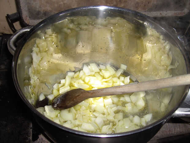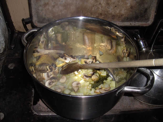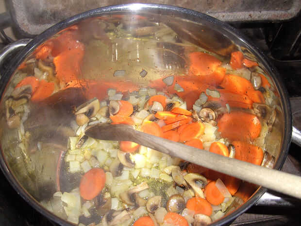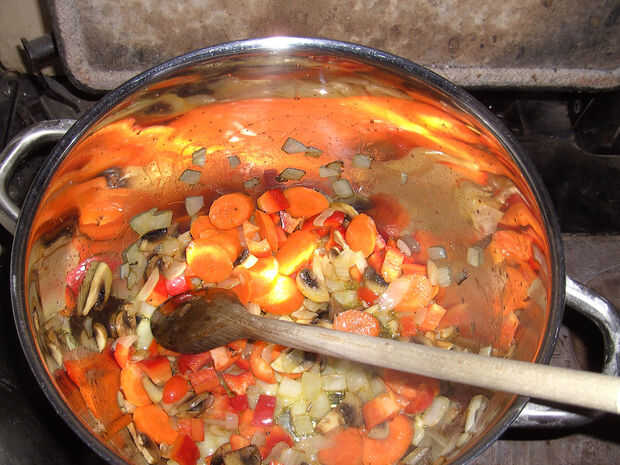 Siempre calentar un poco el aceite y luego añadir la cebolla y dejar freír un poco. Tan pronto como mira suave va la seta seguida de cerca por la zanahoria y el pimiento. Debido a cómo la estufa calienta la sartén sólo necesitas agitar de vez en cuando. En esta etapa normalmente añado algunos tomates frescos pero había funcionado hacia fuera.