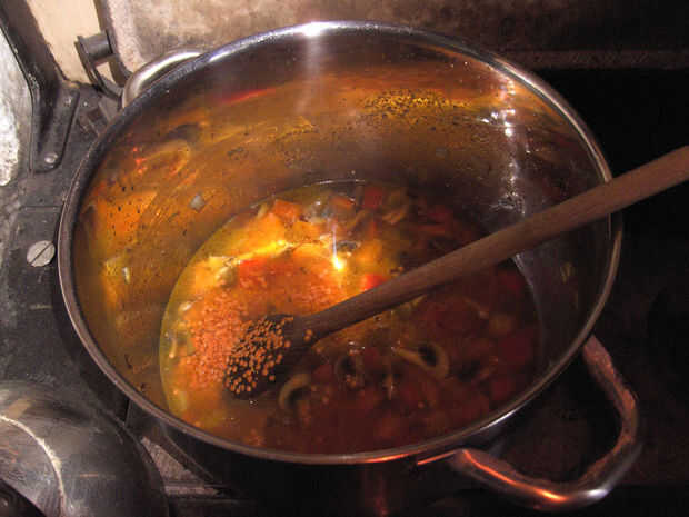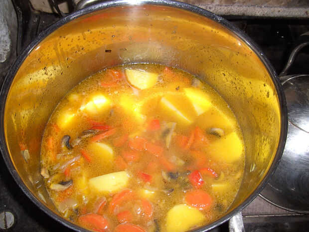 Después de un tiempo se ablande la verdura y luego añades agua y las lentejas. Deje el guiso hasta que las zanahorias son cocidos y añadir la patata y un poco más de agua.