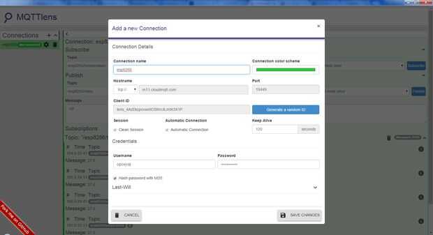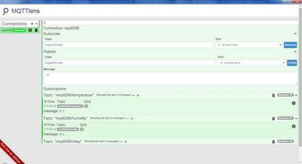 Cualquier cliente MQTT puede utilizarse para conectar con el corredor de cloudmqtt para mostrar los mensajes publicados por la Junta. He utilizado una aplicación de Chrome llamada MQTTlens.