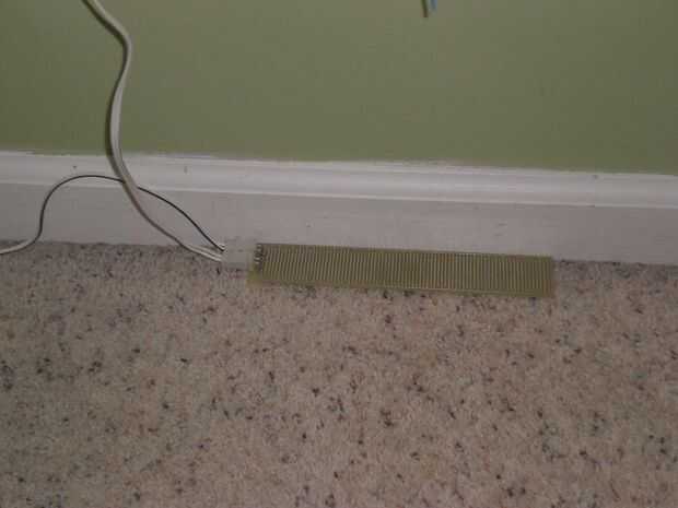 - Los sensores son simple circuitos resistivos que se puede ampliar (grandemente! Tengo 12 conectado a una consola!) por los cables en serie. Además de todos los sensores en el piso del dormitorio, me empeñé en tener un sensor en el gabinete del fregadero también. Tenía que ser un poco creativo con el cableado. Separaron ya la consola y el solenoide empalmando en casi 20 pies de cableado, pero ahora tenía que enviar y devolver las señales del sensor también. 6 conductor cable de termostato resultó perfecto para esto. Identifique los conductores de forma apropiada: energía +, energía-, enviar +, enviar-, volver +, volver-. No importa qué colores utilizar, por supuesto. Solo eso les línea encima de la derecha.