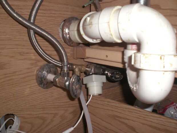 Una t de latón para dividir el agua debajo del fregadero.