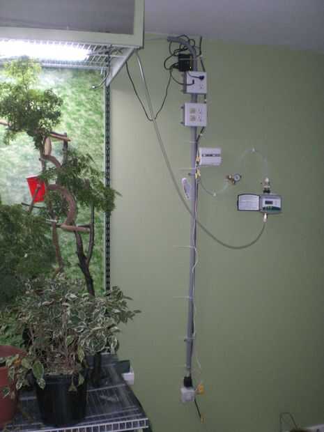 He añadido un interruptor para cada circuito y el circuito de la lámpara de calor ha incorporado un termostato del aparato estándar reptil. Este dispositivo regula normalmente algún tipo de calentador eléctrico en una jaula cerrada reptil, pero que funciona en la gama libre bien matando a todas las lámparas de calor si la temperatura sube demasiado alto. Todas las luces en un contador de tiempo, pero las lámparas de calor son también un termostato. De esa manera son controlados día y noche. Camaleones es necesario un baño en la temperatura durante la noche, así que esto funciona bien. Podría adaptar fácilmente el sistema para proporcionar calor durante todo el día con emisores de infrarrojos y de cerámicos si es necesario.