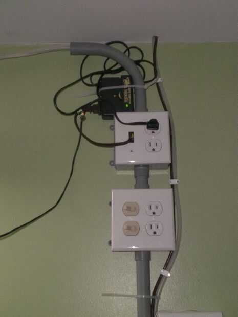 Yo quería dos receptáculos en el techo sobre cada sección de la gama libre, y quería en circuitos separados: un receptáculo para los fluorescentes UV y otro para los focos de calentamiento. Otra vez, realmente no quería cortar las paredes y techo para instalar "profesionalmente" este extraño cableado superficie-montado y me corrió hasta un enchufe. Todo el aparato es sólo una gran complicada extensión.