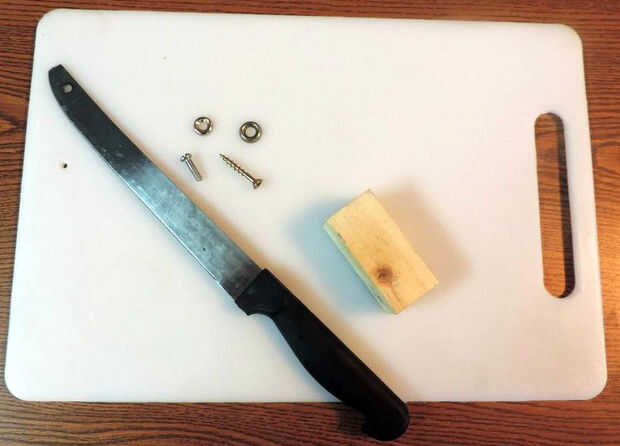 Un rectángulo de madera, plástico u otro material adecuado y perforó un agujero en medio de un lado, que será la parte inferior del bloque y se alinee con el agujero en el tablero de corte. Un segundo orificio piloto debe taladrarse en el lado izquierdo del bloque para el tornillo que se sostenga el cuchillo.
