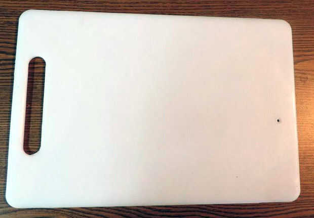 Compré un tablero de corte plástico de la tienda de dólar y perforar un agujero en el extremo opuesto a la manija.