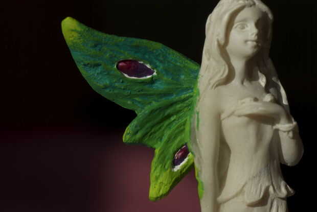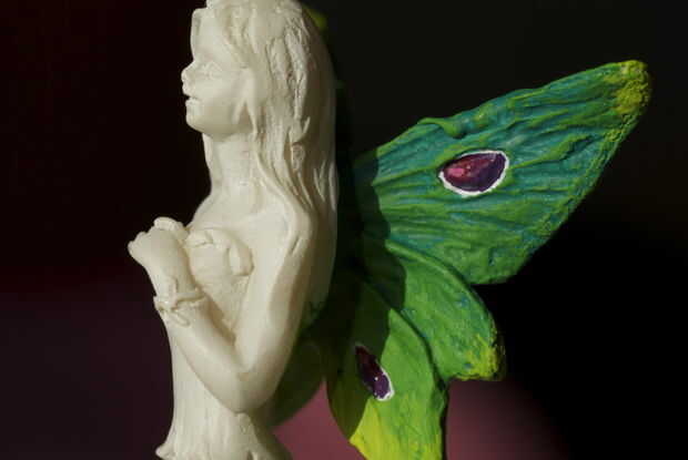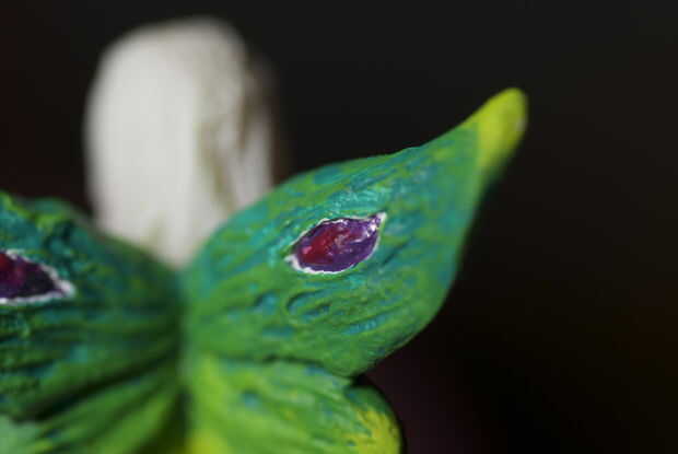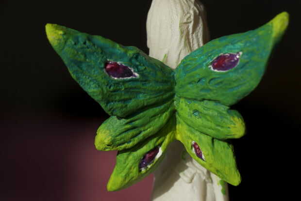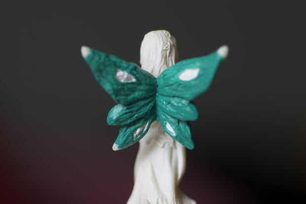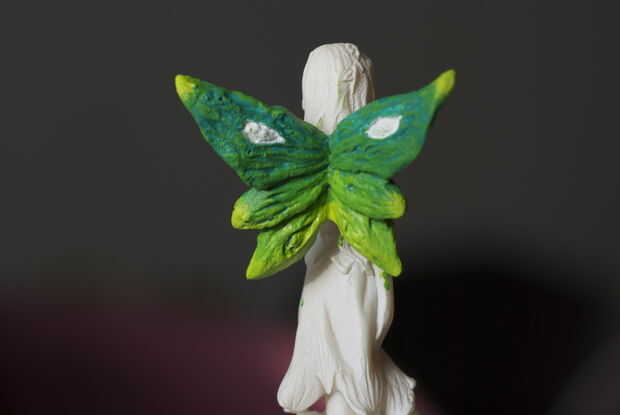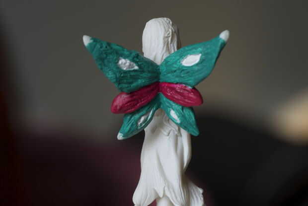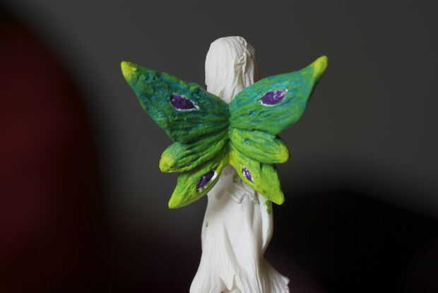 Para los "ojos" de las alas entonces pongo algo de blanco para limpiar la superficie. Luego usé un púrpura azulado.