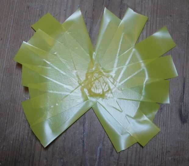y he decidido que sus alas también deben ser PVC amarillo.  Cinta se aplica a ambos lados, esta vez en un patrón de radiación, por su efecto visual.  Se ha aplicado a ambos lados, permitió a pegarse a sí mismo de unos 5mm todo el camino alrededor del exterior de la pestaña de plástico y cortado en ese punto.