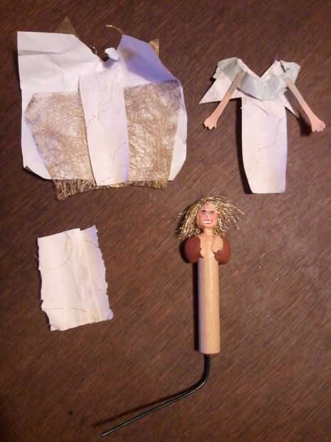 Ella se pinta con pinturas acrílicas y paciencia. El pelo es hilo de oro de una tienda de artesanía - este tipo parece tener un núcleo de algodón envuelto en la vaina externa metálica. Y ahora puedo ver cómo he hecho el "cuerpo": todo lo que necesitaba para dar el volumen de su vestido era hombros. He hecho de dos manchas de barro de epoxy de parte dos Milliput. La pintura cae sobre el pecho para permitir que el vestido. Podría del molde de un busto si quería ser más núbiles. Los brazos son cardboad, 1,5 mm de espesor, corte de (supongo) algo así como los sobres de refuerzo podría obtener una fotografía o certificado delived en. Ha sido perforar un orificio en el extremo inferior de la espiga y un pedazo de verde pega alambre revestido de jardín.