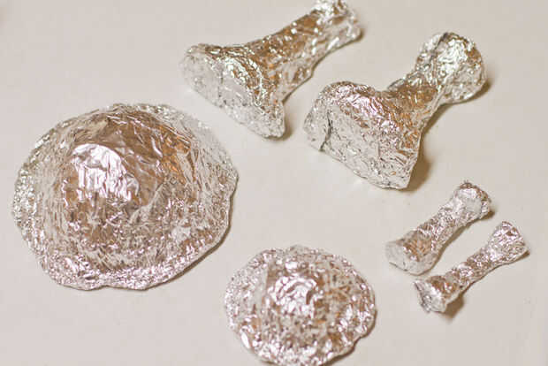 Asumió el papel de aluminio, y doblando y balling para arriba a creado la forma general de la tapa de la seta. Luego seguí agregando a él hasta que fue el tamaño que quería. Para el tallo he creado dos mitades, lo que los hace tan cerca en la forma como pude, y entonces estar parado ellos al lado de unos a otros para asegurarse el producto final era la misma altura y tamaño. Hice los extremos del tallo mayor entonces el medio para que tuvieran una base constante y por lo que la tapa se encendería más fácil... Y porque me gusta la forma que se ve! A continuación los cubrí con papel de pergamino. Que fue muy difícil al principio porque no podía usar cualquier cinta debido a que iba a ser cocido al horno, además no se pega cinta de papel de pergamino. No se pudo incluso pegamento! Finalmente sacó una grapadora de oficina habitual, y rápidamente se convirtió en mi mejor amigo. Yo pude disparar grapas directamente a través del papel y pegan en la hoja, sosteniendo el papel en su lugar. Además, no tiene que ser perfecto. La masa de pan de jengibre con ayuda mantenga el papel en su lugar.