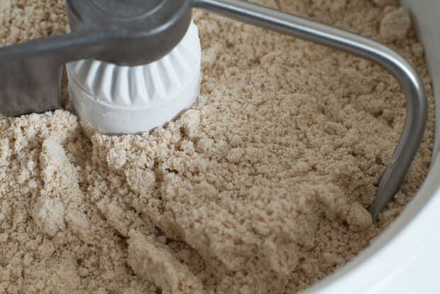 Me sorprendió un poco gruesa y quebradiza la masa fue ante mano amasado. Pero después de amasar, es absolutamente realizable, aunque seguirá siendo extremadamente rígido. Si todavía está demasiado seca Añadir un poco de agua y trabajar en la masa.