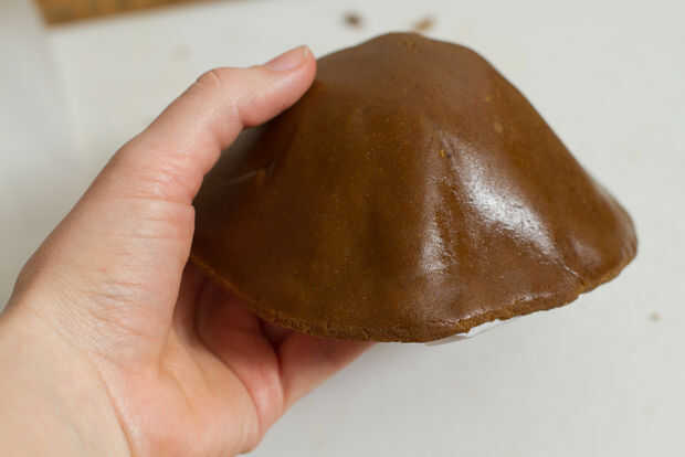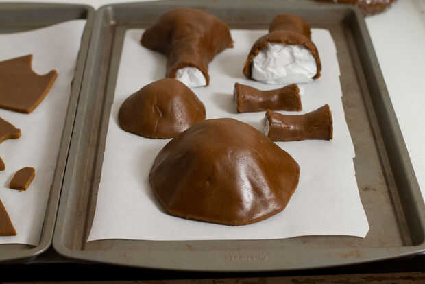 Tome un pedazo de masa y moldear en un círculo. Rollo espesor como para las casas, pero tener una forma redonda en vez de rectangular.  Para estimar el tamaño usted necesita usted querrá unos 2" extra todo el camino alrededor de la seta cap plantilla.  Cuando la masa esté uniforme grueso como se indica en el paso 2 de 3/16", coloque una pieza extra de papel sulfurizado sobre la masa y el rodillo con el rodillo.  Dale la vuelta, quitar el papel inferior y cuelgue masa plantilla de casquillo de la seta con el lado de papel hacia arriba. El documento de ayuda a la masa para formar sin romper tan fácilmente.  El objetivo aquí es moldear la masa en la tapa de seta con rotura mínima y sin crear doble masa espesa. Se puede hacer! Trabajar con la masa hasta que se forma a la tapa de la seta.  Si se produce algún desgarro Junte los bordes rasgados y trabajar con él hasta que ya no está separada.  Retire el papel de pergamino, coloque seta lado plano hacia abajo en la cubierta de pergamino para hornear y recortar la masa sobrante. Recoger hongos y con los dedos alisar los bordes cortados hasta que son ligeramente redondeadas y aspecto naturales.