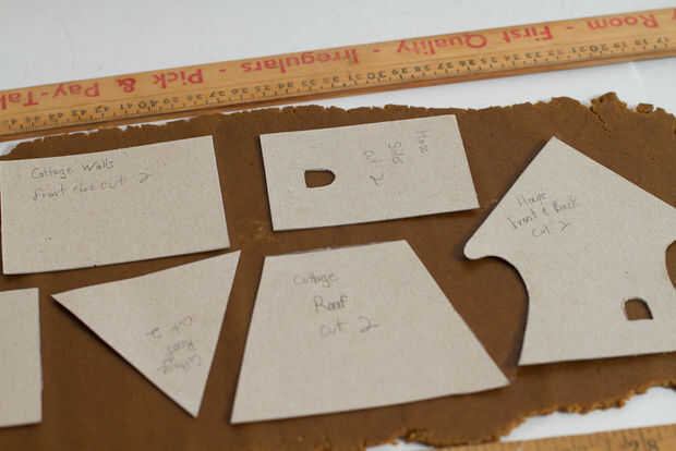 Si usted está confiando en sus habilidades puede omitir esta parte, pero como veis en la foto corto extra de cada pieza (es decir, en vez de dos de cada pared corté tres y en vez de 1 puerta por casa corté 2) así que si tuviera algo salir mal durante el horneado o el proceso de decoración tengo otra pieza ya disponible para usar.