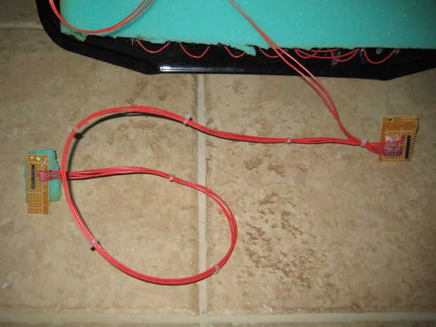 El circuito del dispositivo moderno pretende ser impulsado por algo así como un microcontrolador Arduino. A pesar de que el Arduino en última instancia controla 64 LED, solo necesitas 4 hilos para datos y 2 para la energía procedente de Arduino. Formó un improvisado cable para conectar las 2 unidades.
