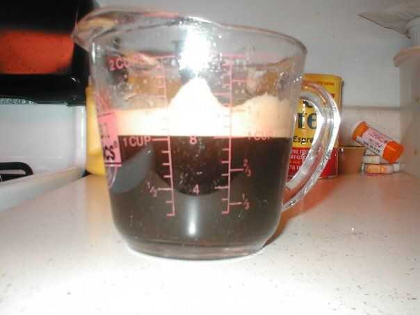Aquí está el café y la goma (azúcar) cocinar juntos y de la vinculación o "caramelizar" el resultado es la espuma "espuma". Como veis ocho onzas de café se hace... "coloda"