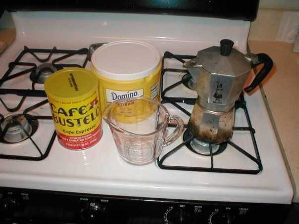 Los conceptos básicos de café cubano. Café Pilon Cafe Cafe Bustelo. Azúcar. Una estufa superior cafetera. Un Pyrex o similar 2 taza taza de medición. Este tipo de café es café de renombre mundial. Utilizar ser asado en Cuba hace muchos años pero ahora es asado en Miami. http://www.javacabana.com/ revisa el enlace "quienes somos" de algo de historia sobre Cuba café tostado. ;-)