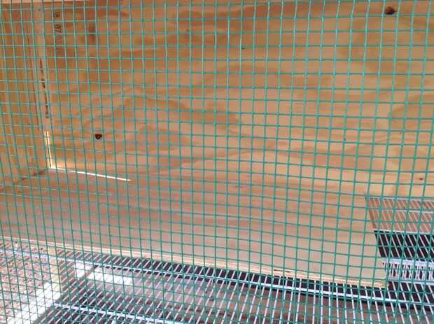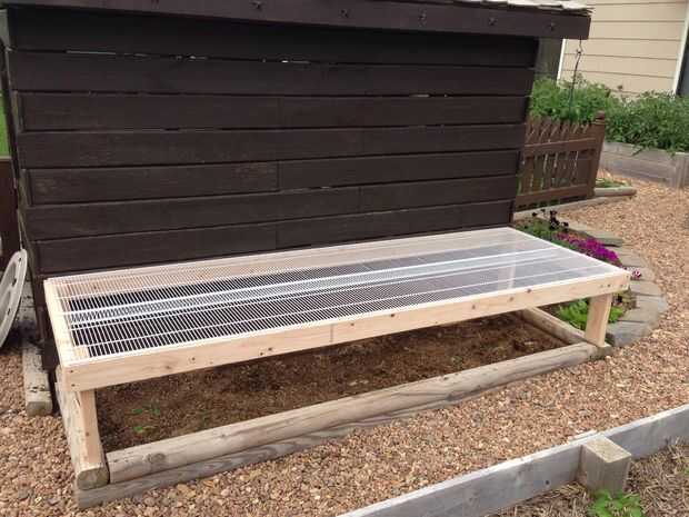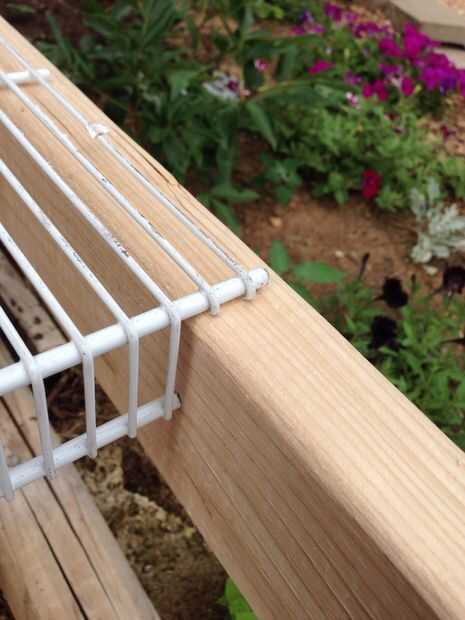 Para el piso, se utilizaron estantes de alambre recubierto utilizados para un armario interior. Utilizamos dos 8 pies por estantes de 16 pulgadas con la malla más apretada disponible (llamado "cierre malla") fabricado por "ClosetMaid." Poner la "L" en forma lateral hacia el centro para la fuerza agregada del piso, luego zip atarlos juntos cerca de la parte inferior para evitar que curiosos conejos masticando apagado. Hemos recortado los bordes de los estantes de malla con una herramienta giratoria.