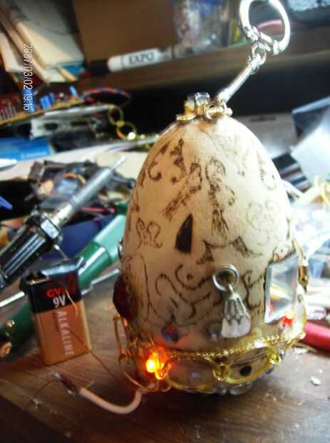 y agregué un poco de color brillante al huevo: algunos LED y unos adornos para reflejar la luz así como un flaco y una cadena de gran oro . Gluie caliente fue "autoadhesiva del día" luego con Elmer para unos thtaa de cosas necesarias para antes de. :-)
