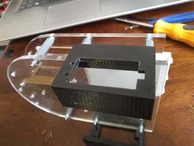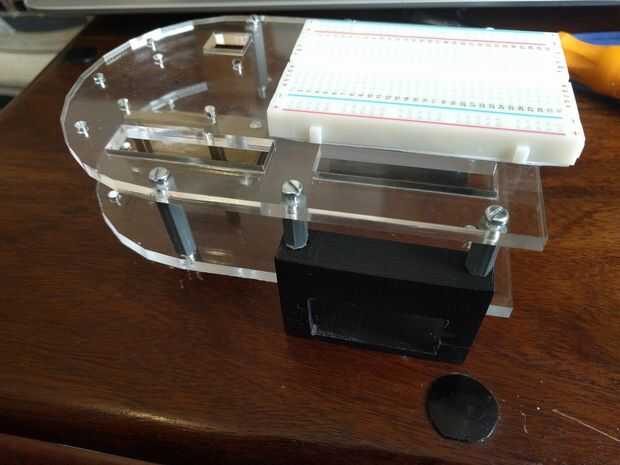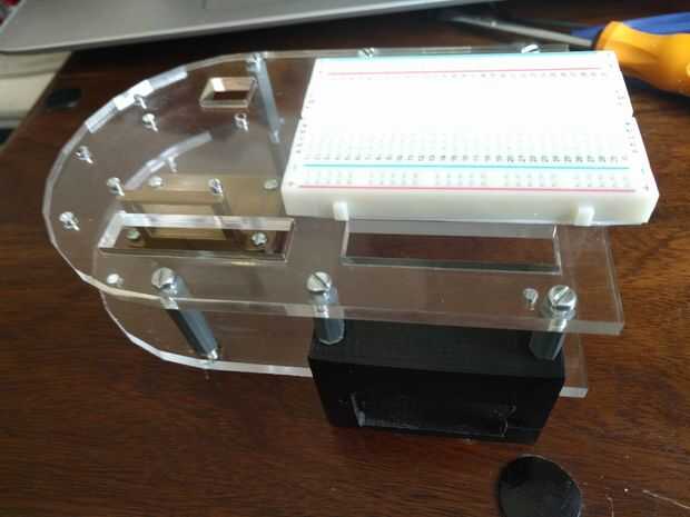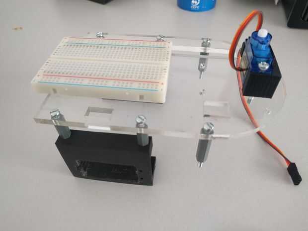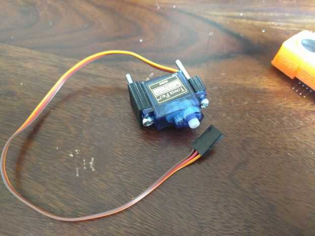 6. Conecte un mini servo a un soporte motor con los tornillos. Luego fíjela a del tablero superior con tuercas.