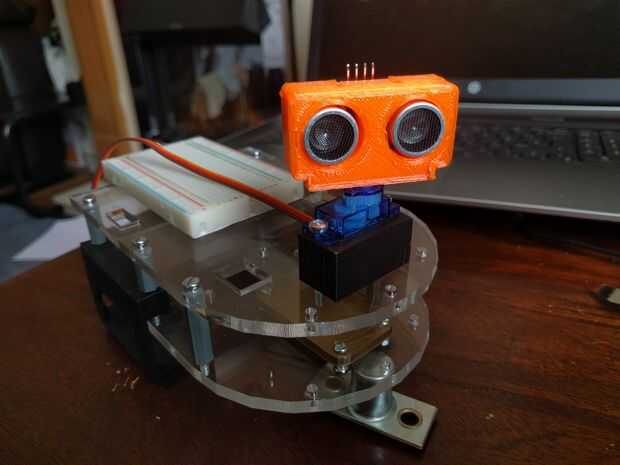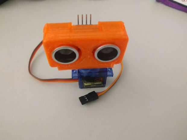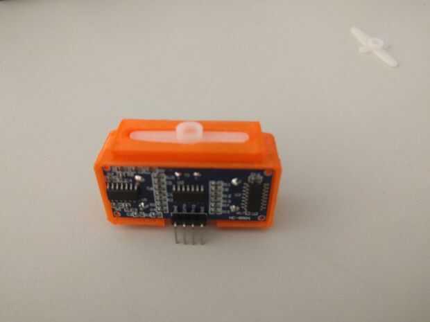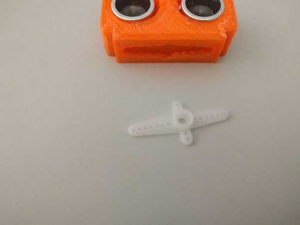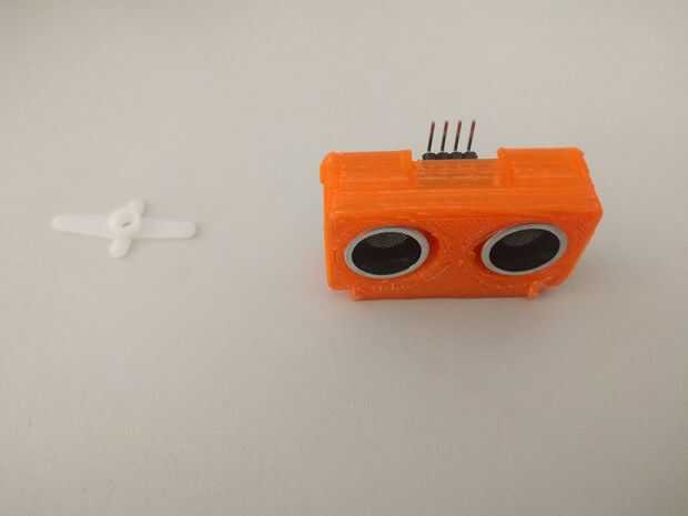 4. conseguir su sensor ultrasónico e inserte en sensor ultrasónico f_holder luego pegue un engranaje de un mini-servo tal como se muestra en la imagen a la parte inferior de la sensor ultrasónico f_holder. Ahora poner esto en un servo después el pegamento ya seco y compruebe si gira muy bien. (no pegar a servo todavía).