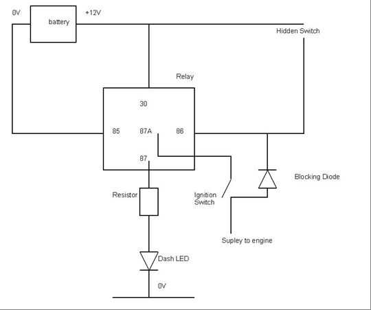 este es un circuito muy simple inmovilizador automático para un coche o una moto. Se hace de un resistor de 1 diodo 1 relé de 30A coche y 1 intermitente led y algunos cables. Debe ser capaz de comprar estos artículos de maplin o algún lugar similar.