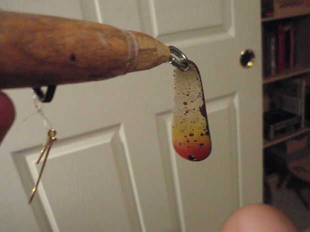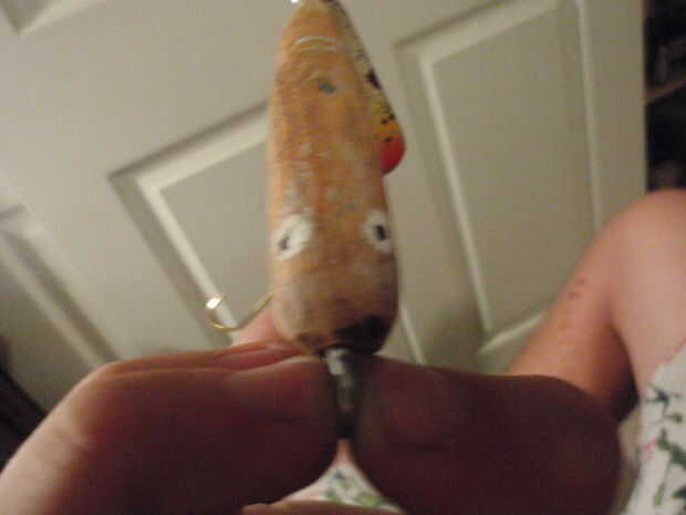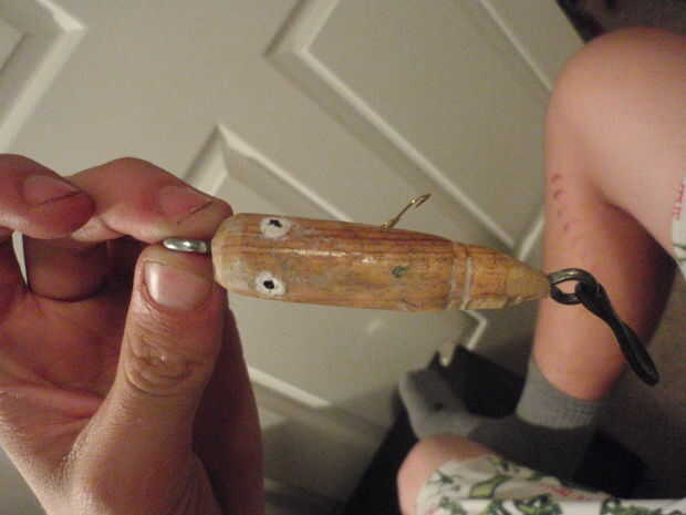 este es un señuelo que construí hoy después de ver el instructivo de Stever0812. Sus señuelos se hacen mucho más profesionalmente. Este fue sólo un primer intento, y tuve un momento realmente difícil asegurar los ganchos. Al final, simplemente até les con alguna línea de pesca alrededor de una pequeña grapa en la parte inferior del señuelo. No tengo cualquier pequeños ojales, split anillos o ganchos agudos, por lo que acabo de probar con vencidos. Había tomado fotos del proceso de lo que es, pero mi computadora estaba siendo extraña. (Con suerte) será capaz de poner unos cuantos el proyecto terminado. La pieza de metal en el extremo del señuelo es algo que encontré, como se muestra en un anterior instructable.