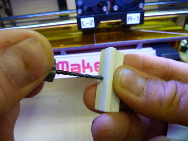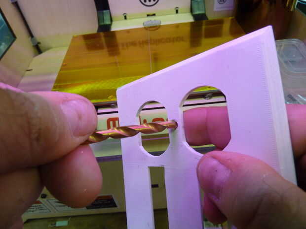 El mango está diseñado para ser conectado con un tornillo #4. Impresoras 3D impresión normalmente los agujeros más pequeños que diseñó, así que decidí abrir al jefe de recepción en el mango con un taladro también. Si utilizas un plástico durameter baja, no necesitará hacer esto.