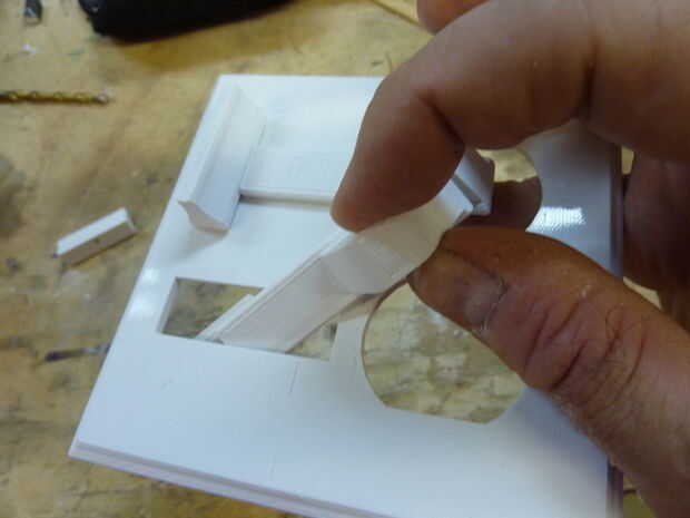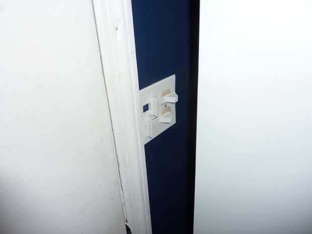 Notarás un par de fichas rectangulares debajo de la placa. La pared está pintada de azul y me gusta el hecho de que fácilmente puedo ver si la luz está encendida. Si veo azul, está apagado. Si no gusta el color de las paredes, o sólo quiere un blanco o fuego rojo ranura, corte una delgada (. 020" o algo así) trozo de papel plástico o rígido el área definida por las pestañas y pega a la placa antes de atornillar a la caja eléctrica.