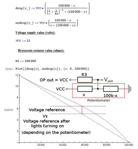 Como se puede ver, hay histéresis cuando el potenciómetro se encuentra cerca de los extremos, por ello es importante fijar un resistor del divisor del voltaje correcto que permitirá que el circuito funcione en el centro de gama media-baja.
