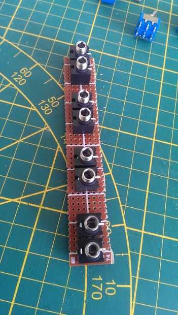 -Ahora que tienes un perfboard con tomas es más fácil estimar lo que la colocación debe ser para todos los componentes en el panel frontal. (Las tomas de thonkiconn tienen las entradas a un lado cuando se coloca horizontalmente, así que recuerde esto al buscar los lugares de las tomas). También Recuerde que usted necesita alejarse de la parte superior e inferior del panel para alrededor de 1 cm ya que es donde estarán los carriles de montaje!