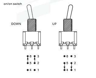 -Depende de qué tipo de interruptor utiliza el pinout puede diferir. He utilizado interruptores, ON/ON que (como se puede ver en la foto) une los dos pernos superiores cuando hacia abajo y el menor dos pines juntos cuando hasta. Recuerde que el centro es siempre la salida. Así que si no estás seguro de cómo conectarlos, puede siempre encontrar una descripción del componente (como encendido/ON o encendido/apagado) y encontrar la correcta conexión en google. O sólo probar uno y ver qué pasa.