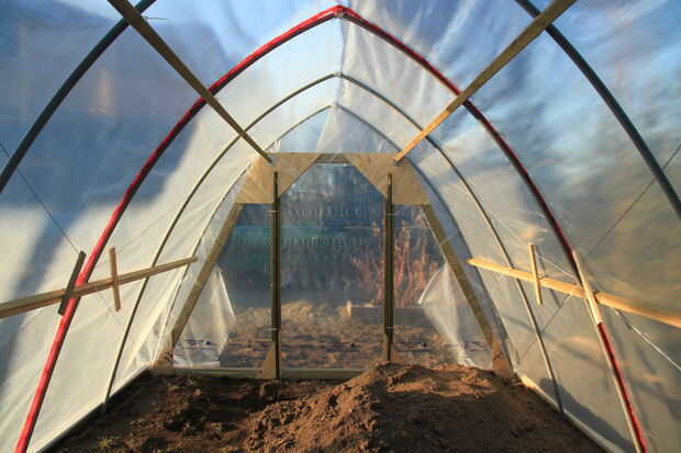 Poner la película entera de plástico en el invernadero, céntrela y grapas a las paredes verticales. Fije la película con tablas de 1 por 2 en el marco y recorte el exceso